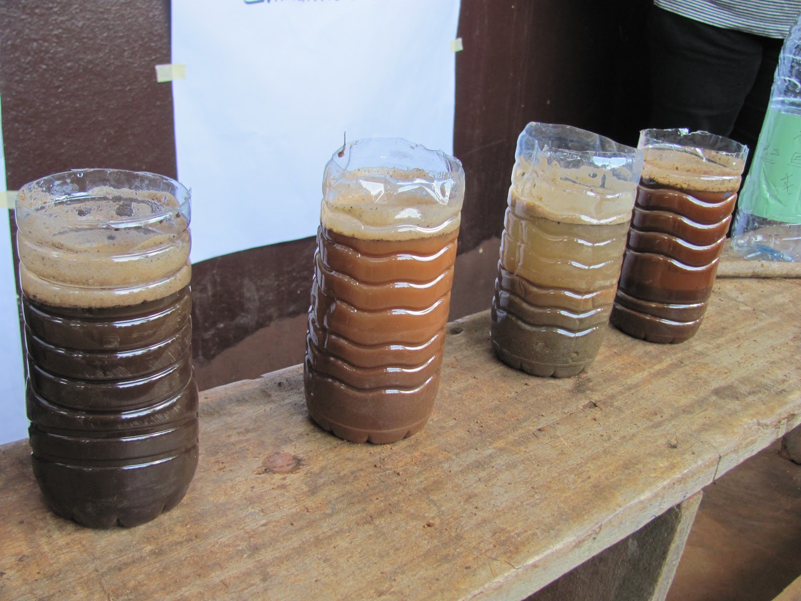 several the tops off of four two liter water bottles. We brought tap water from the hotel. Once the soils were mixed with water, they